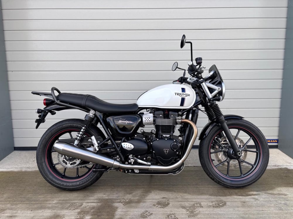 A really beautiful example of the most classic motorcycle available, the Triumph Street Twin. This is in the amazing off white, with the classic Triumph logo on the tank. Fantastic condition through out, full dealership service history, tyres have less than 300 miles on them, Genuine Triumph heated grips, genuine Triumph fly screen, Genuine Triumph centre stand, Genuine Triumph rear rack.